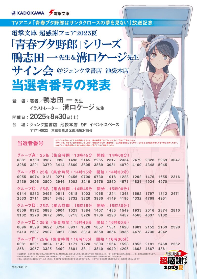 TVアニメ『青春ブタ野郎はサンタクロースの夢を見ない』がいよいよ7月5日(土)放送開始! 電撃文庫超感謝フェアにあわせて、今年も大人気シリーズ『青ブタ』のサイン会が開催決定です!! 7月10日(木)に発売となる初の短編集の購入も抽選の対象となりますので、この機会に是非奮ってご応募ください!