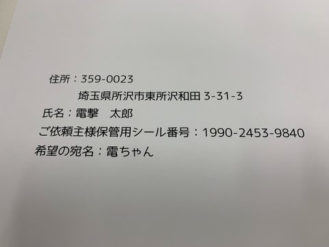 <STEP:B>「住所」、「氏名」、「ご依頼主様保管用シール番号」、「ご希望の名前」を記載した紙を同梱してください。(※ご希望の名前が、サインに記載する「宛名」になります)