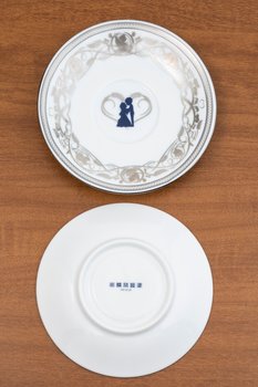ソーサーの中央にはホロとロレンスのキスシーンを描いたSDイラストと麦穂でデザインされたハートマークが描かれ、裏底には原作ロゴが刻印されています。