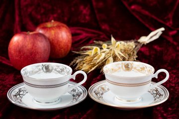 賢狼ホロと行商人ロレンスの旅を描いた電撃文庫の大人気作品『狼と香辛料』。長い旅路の果てに辿りついた温泉地ニョッヒラで結ばれた二人の結婚式をテーマに、ホロをイメージした金&レッドと、ロレンスをイメージしたプラチナ&ネイビー・ブルーのペアカップ&ソーサーセットをご用意しました!
