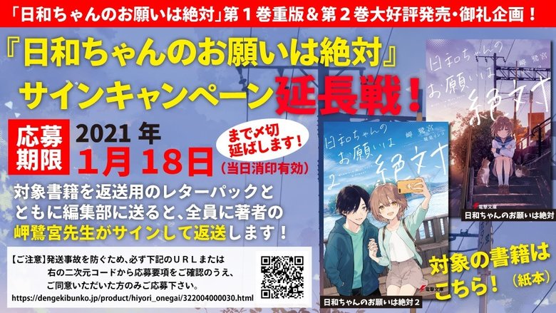 下記の応募要項をご確認のうえ、対象書籍をお送りいただいた全員に「日和ちゃんのお願いは絶対」シリーズ著者・岬鷺宮先生のサインを入れて返送させていただきます!! 沢山のご応募をお待ちしています!