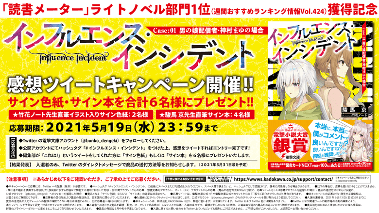 インターネット上で起きる様々なトラブルに女装少年とお姉さんが立ち向かう新感覚ミステリー『インフルエンス・インシデント Case:01男の娘配信者・神村まゆの場合』おかげさまで、読書メーター「週間おすすめランキングVol.424」のライトノベル部門で1位を、「週間おすすめランキングVol.425」のライトノベル部門で5位を獲得しております!