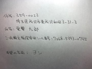 <STEP:B>「住所」、「氏名」、「ご依頼主様保管用シール番号」、「ご希望の名前」を記載した紙を同梱してください。(※ご希望の名前が、サインに記載する「宛名」になります)