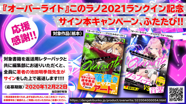 下記の応募要項をご確認のうえ、対象書籍をお送りいただいた全員に「オーバーライト」シリーズ著者である池田明季哉先生のサインを入れて返送させていただきます!!