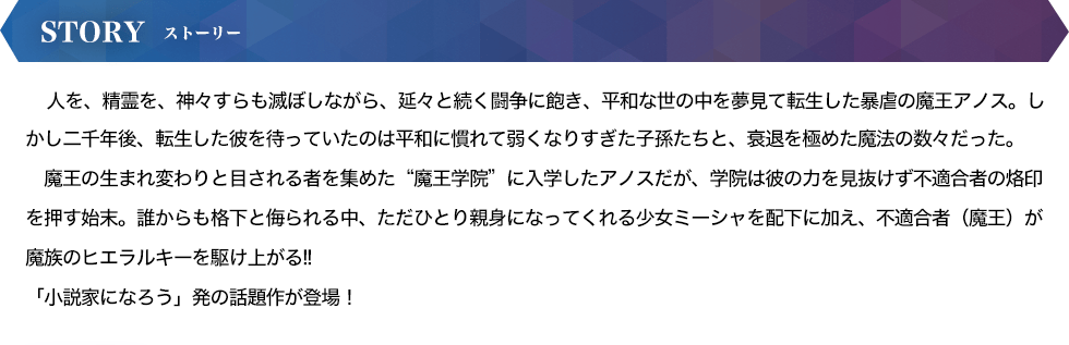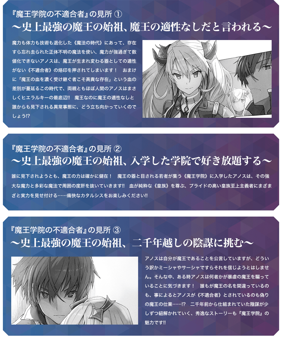 魔王の生まれ変わりと目される者を集めた“魔王学院”に入学したアノスだが、学院は彼の力を見抜けず不適合者の烙印を押す始末。誰からも格下と侮られる中、ただひとり親身になってくれる少女ミーシャを配下に加え、不適合者(魔王)が魔族のヒエラルキーを駆け上がる!!