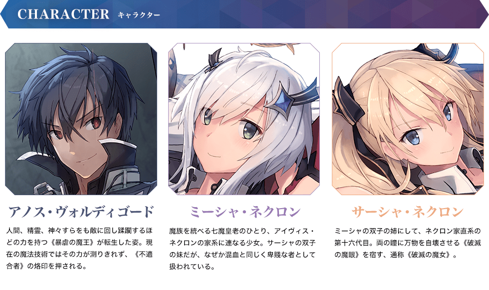 • アノスは自分が魔王であることを公言していますが、どういう訳かミーシャやサーシャですらそれを信じようとはしません。そんな中、ある時アノスは何者かが暴虐の魔王を騙っていることに気づきます! 誰もが魔王の名を間違っているのも、事によるとアノスが《不適合者》とされているのも偽りの魔王の仕業……!? 二千年前から仕組まれていた陰謀が少しずつ紐解かれていく、秀逸なストーリーも『魔王学院』の魅力です!!