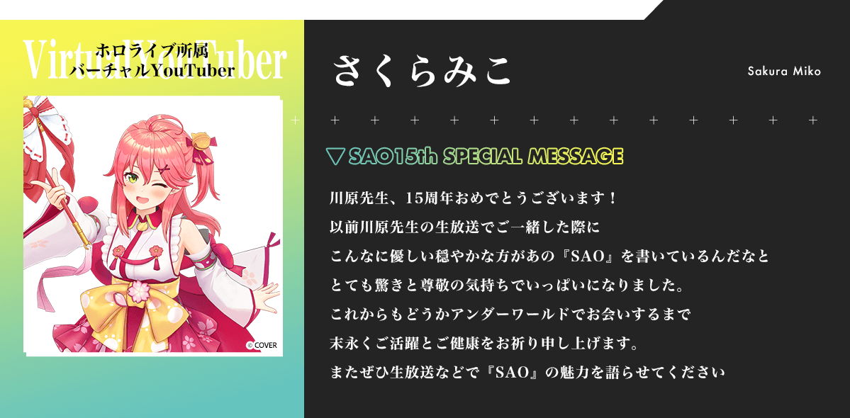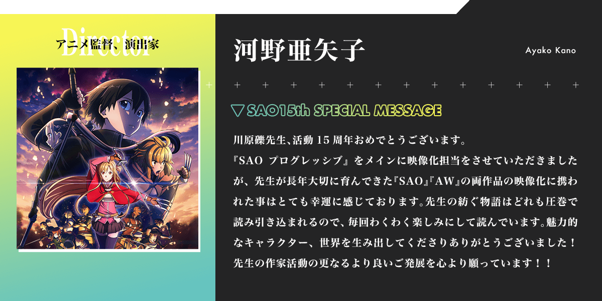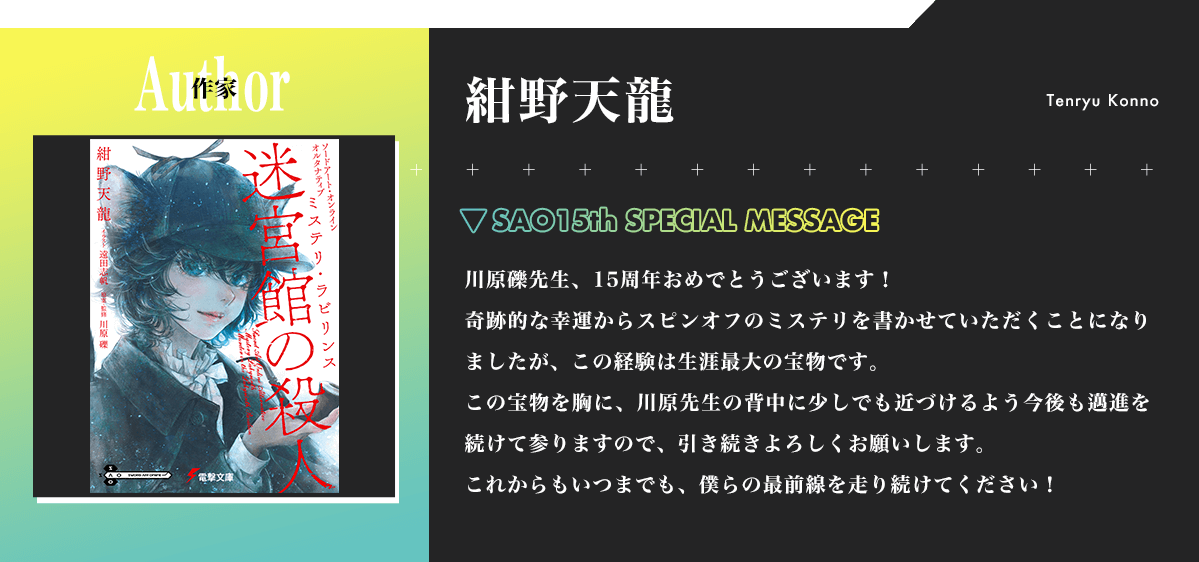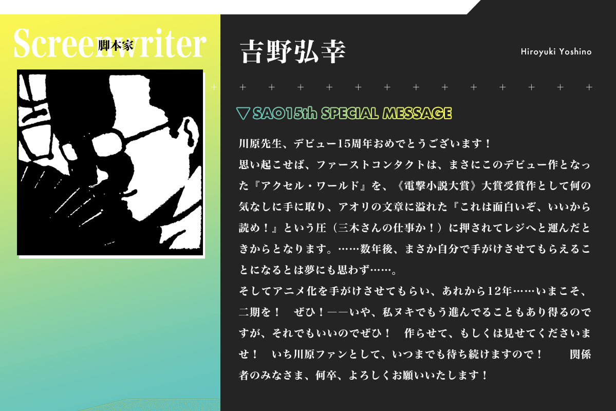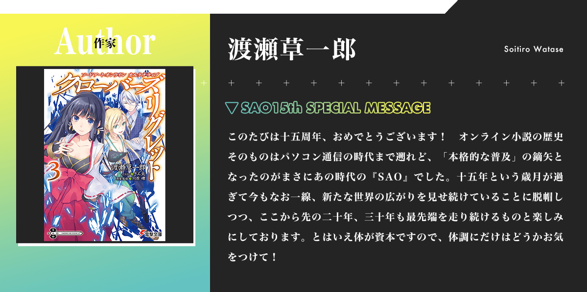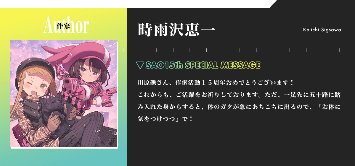 読者の皆様のおかげで『ソードアート・オンライン』は、2009年4月10日の第1巻発売から15周年を迎えることができました。ますます加速する川原 礫作品の展開に今後ともご期待ください!