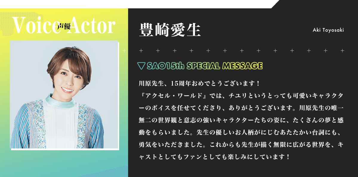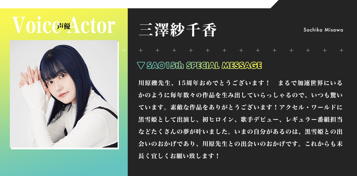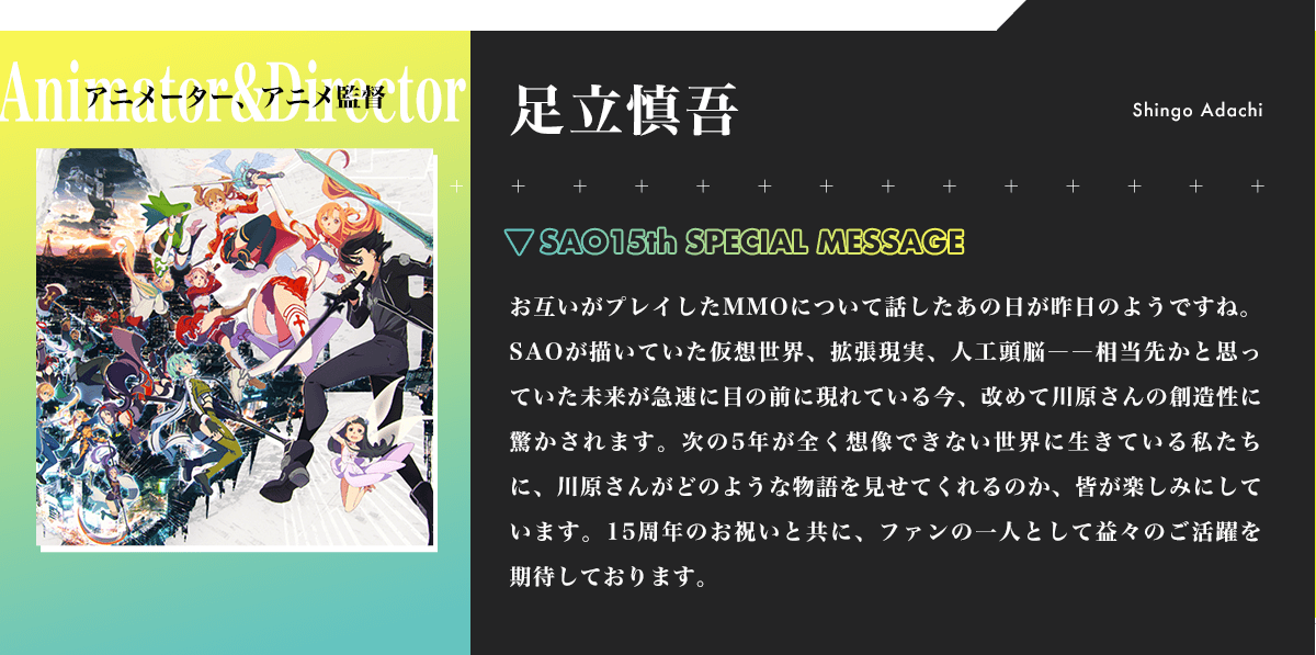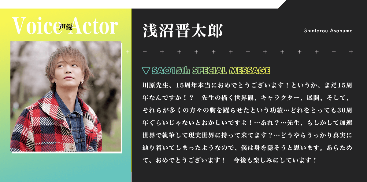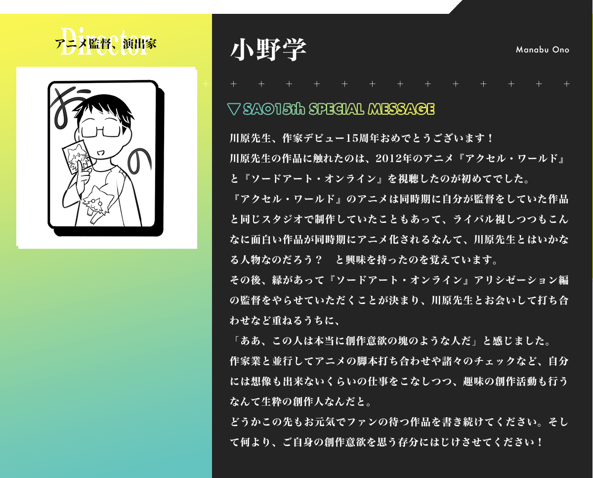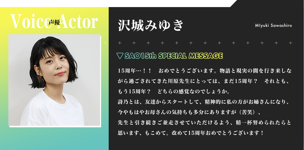 読者の皆様のおかげで『ソードアート・オンライン』は、2009年4月10日の第1巻発売から15周年を迎えることができました。ますます加速する川原 礫作品の展開に今後ともご期待ください!