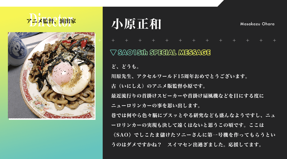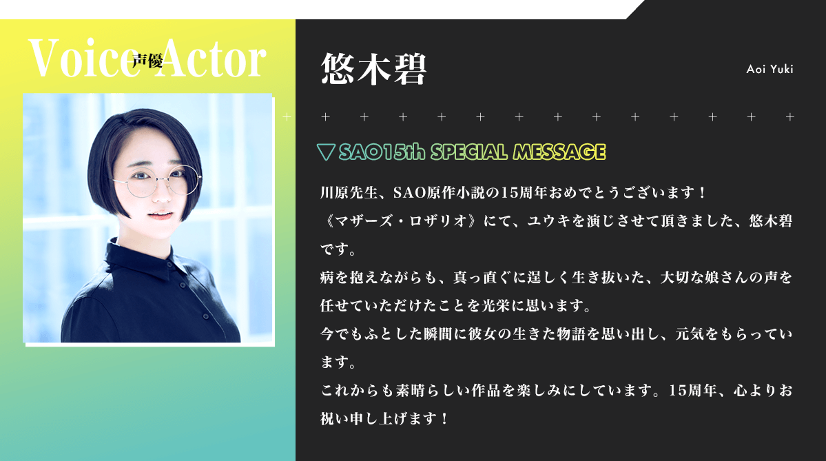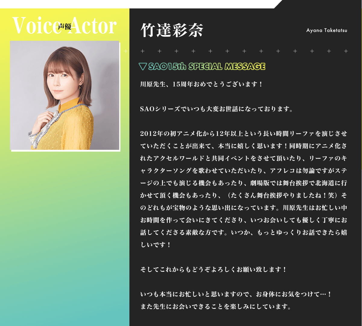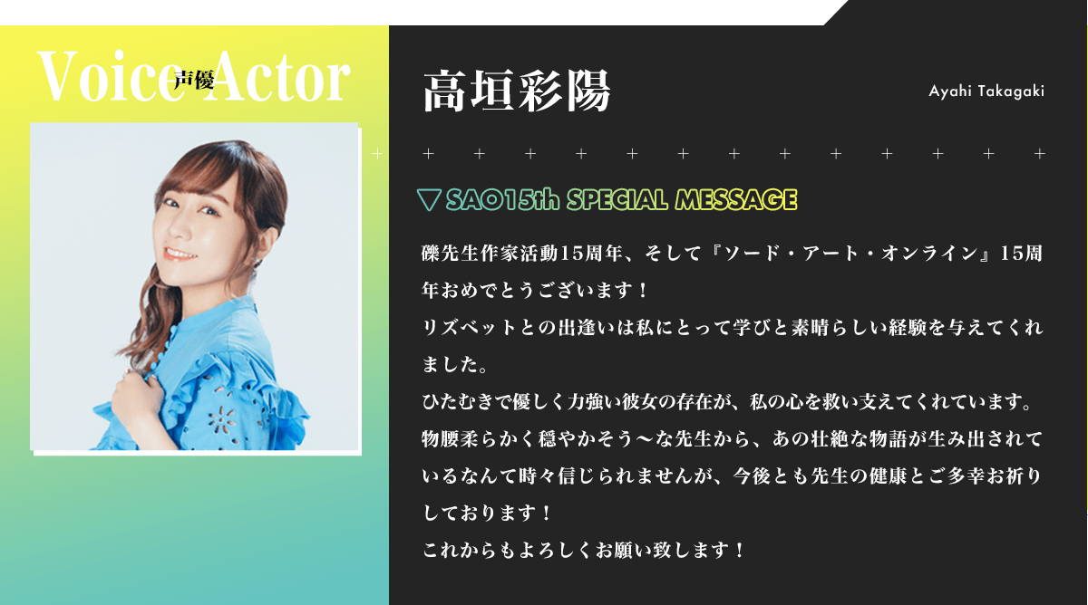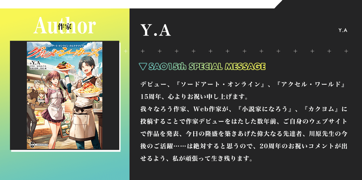 読者の皆様のおかげで『ソードアート・オンライン』は、2009年4月10日の第1巻発売から15周年を迎えることができました。ますます加速する川原 礫作品の展開に今後ともご期待ください!