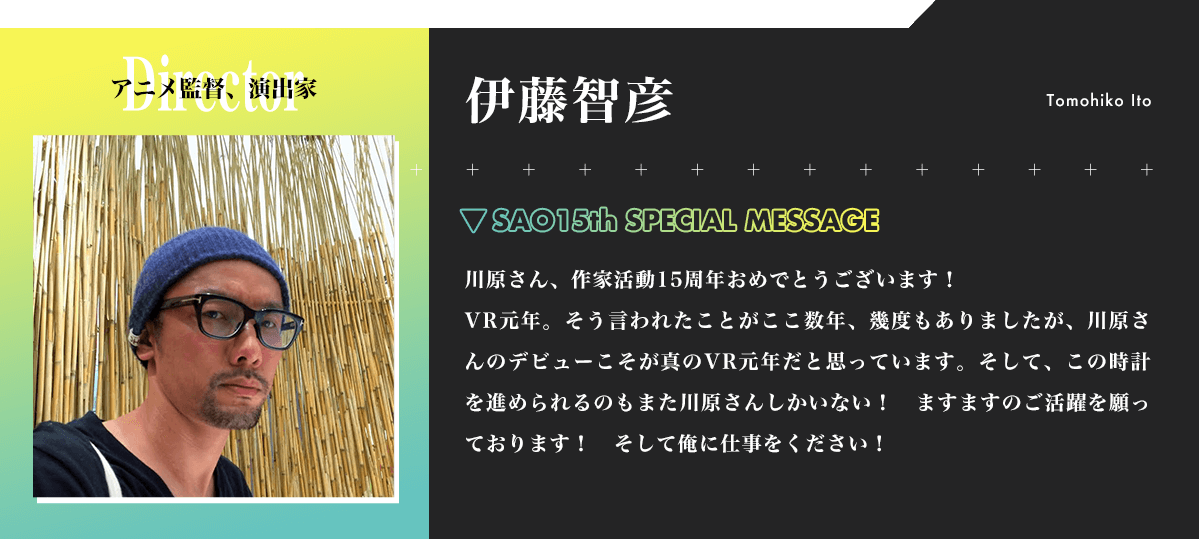 自分のホームページで『ソードアート・オンライン』の初期バージョンを連載していた頃から考えると、ここまでの道のりは決して平坦ではありませんでした。焦りや重圧に耐えかねて、「もう書けない」と思ってしまったことも何度かありました。しかしどうにか10年、作家として活動してこられたのは、私を支えてくださった多くの方々と、そしていままで私の作品を応援してくださった読者や視聴者、プレイヤーの皆様のおかげです。